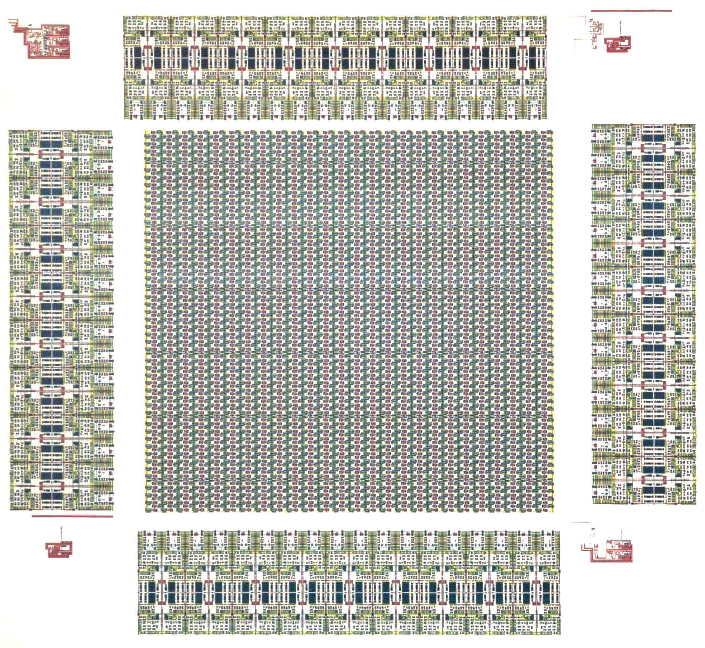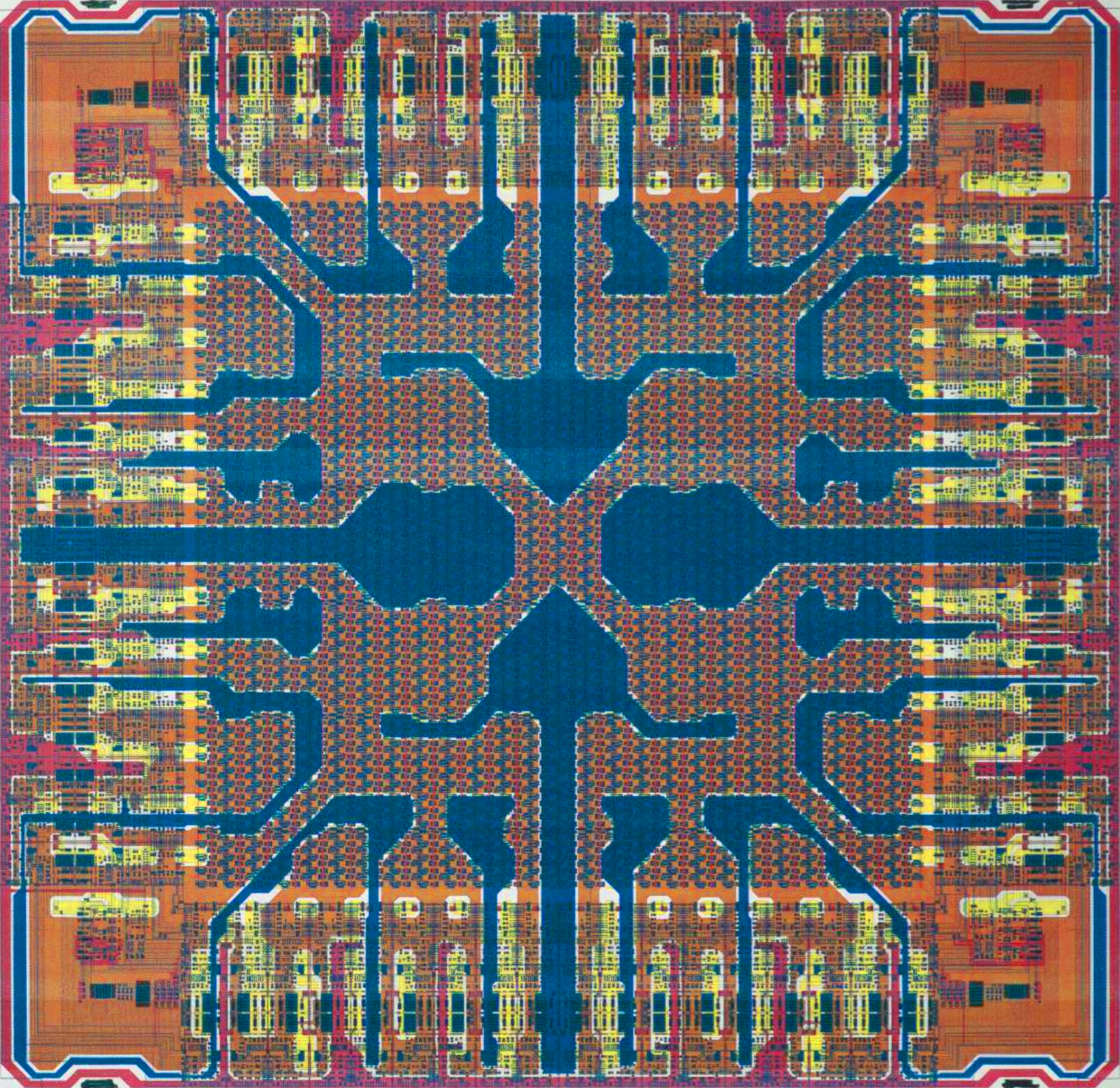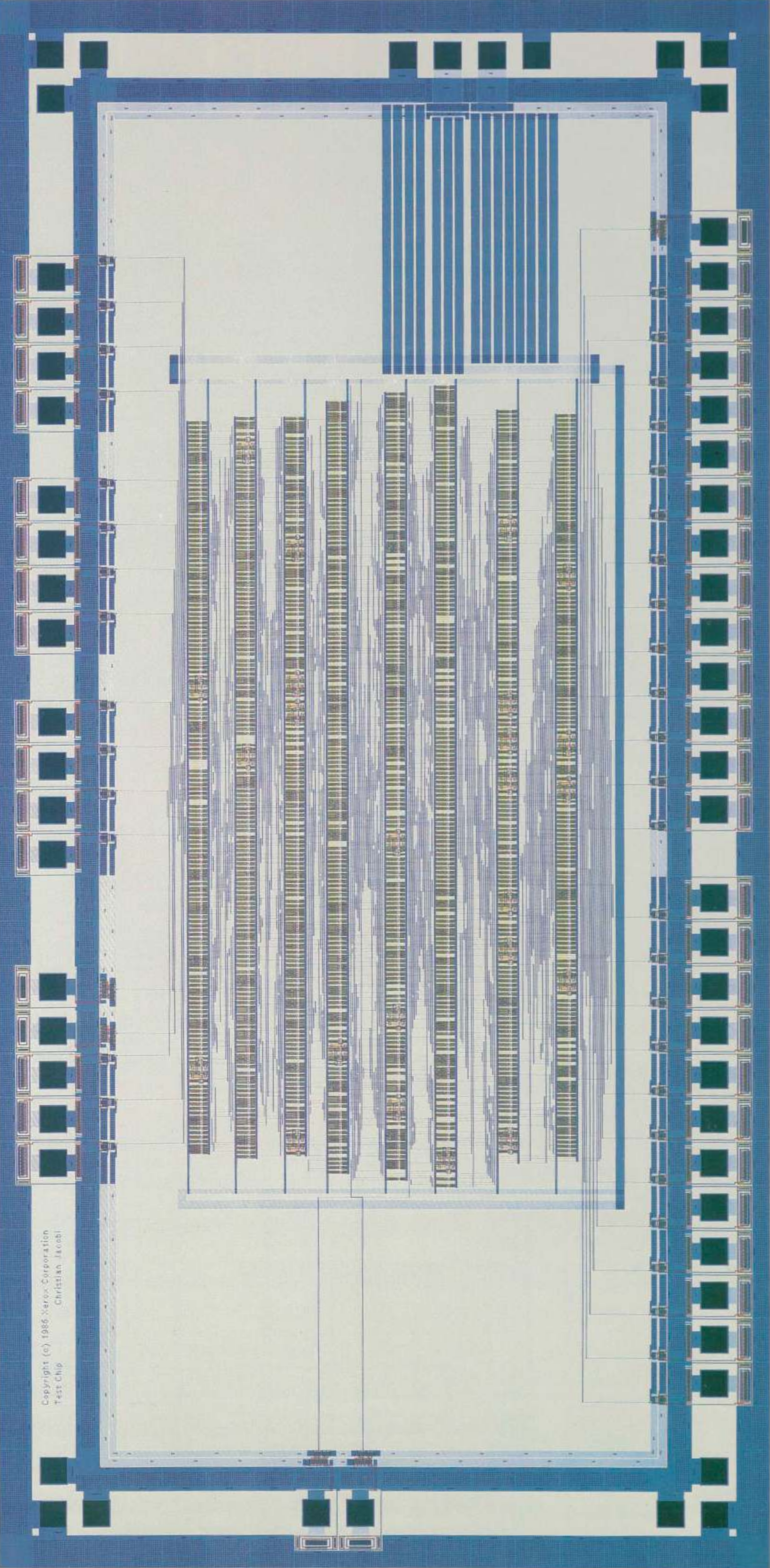 The diagram is of a chip used for testing components of a computer-aided design library.LSI Logic Corporation 1988 250,000 transistors Application-Specific Integrated Circuit (ASIC)