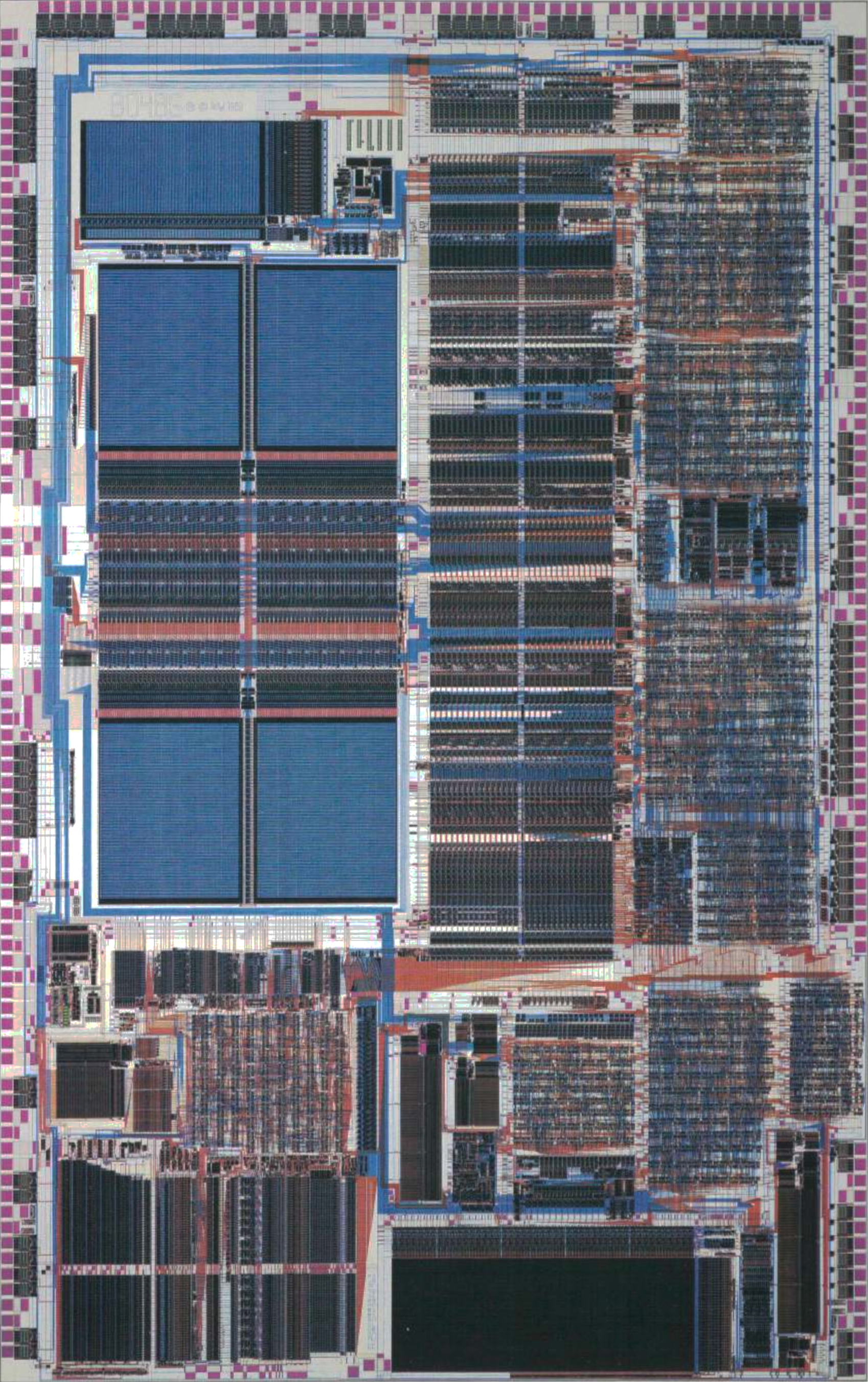 This was designed to improve image contrast in a variety of applications, including medical diagnosis, aerial reconnaissance, and automated inspection systems used in manufacturing. Developed as an application-specific product, it combines memory-cell and gate-array technologies in one chip. The details on the right are enlargements of the two main pattern areas. The top diagram shows the individual cells compromising the memory blocks, the bottom illustrates the gate arrays.VLSI Technologies Inc. 1986 33,500 transistors Application-Specific Integrated Circuits (ASIC)