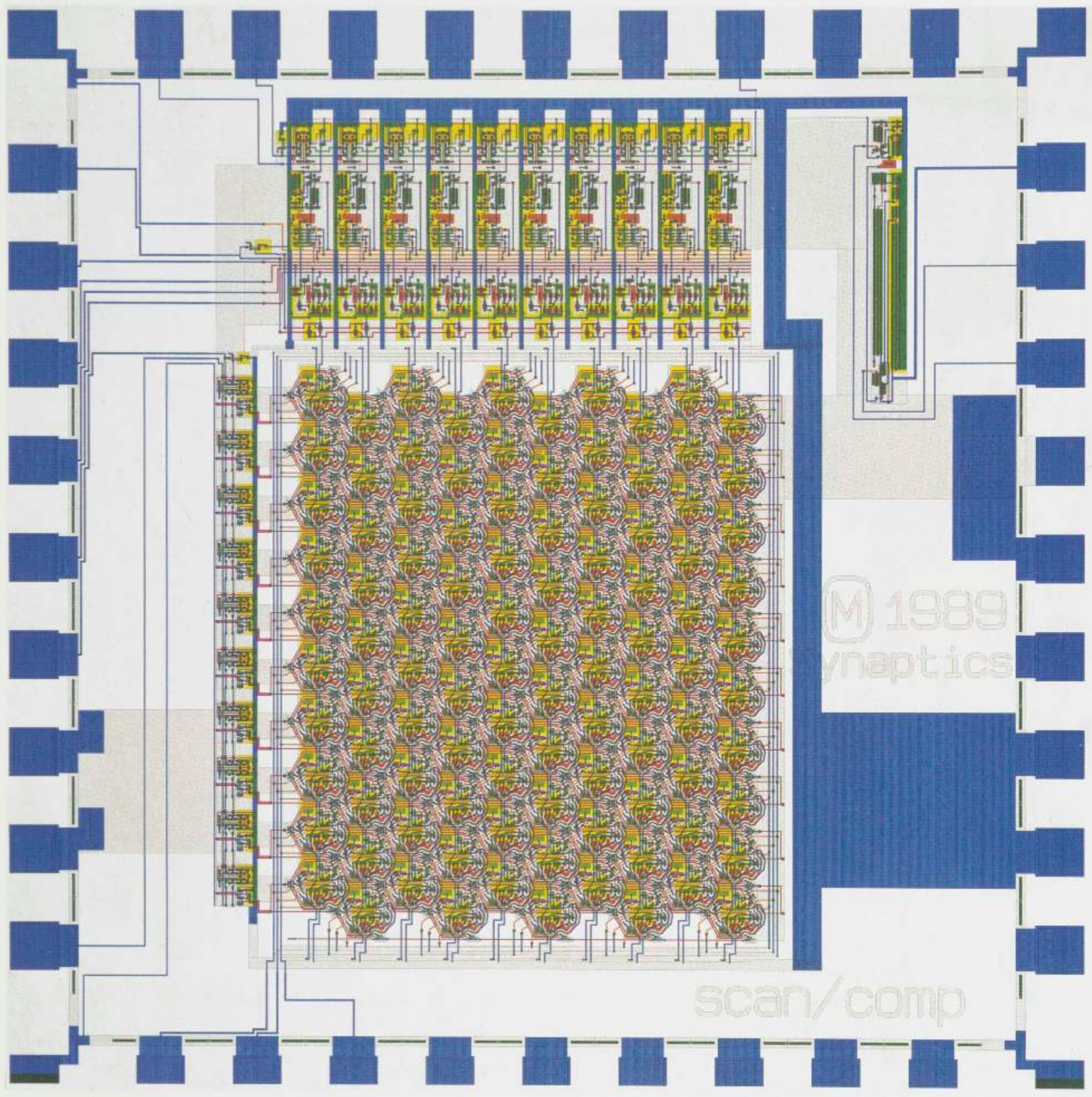 This chip is a photo sensor and was designed to mimic some of the functions of the human retina. Containing a core of 100 electronic processing cells that detect images when light strikes them, the chip performs two operations: it highlights detail in an image, and it orients and locates objects or other features by their edges. The information received by all the cells is averaged and then passed on to a computer for further inspection. The design is based on hexagonal-grid properties, as opposed to the rectangular- or square-grid format found in the other diagrams in this publication. With the hexagonal shape each cell is equidistant from its neighbors, which allows for smoother and more accurate gathering of data.